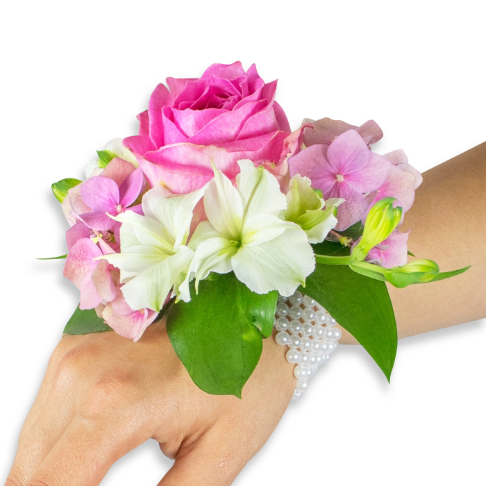 Celebrate in style with our Pretty in Pink corsage. This elegant bouquet features classic pink roses, full hydrangeas, and a hint of white alstroemeria, creating a timeless and beautiful floral arrangement for any occasion.